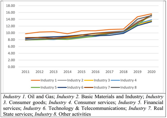Graphique linéaire de l’évolution de la proportion de femmes dans les conseils d’administration des entreprises européennes (2011-2020), répartie en huit secteurs. Tous les secteurs montrent une augmentation, particulièrement nette à partir de 2018. Le pétrole et le gaz, l’immobilier et les « autres activités » sont en tête.